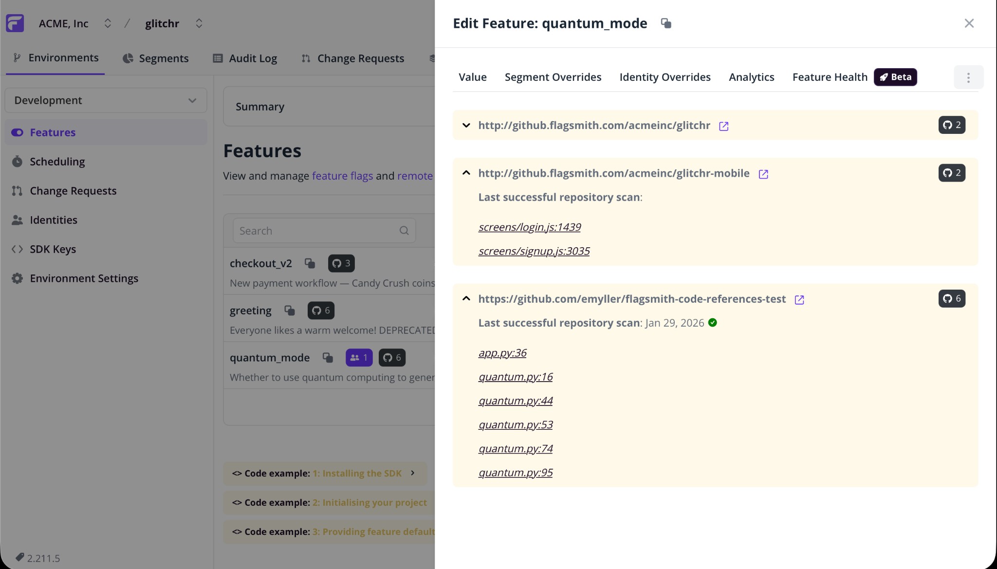 - Visualization: These references are displayed within the Code References tab of the corresponding feature flag in the Flagsmith dashboard.